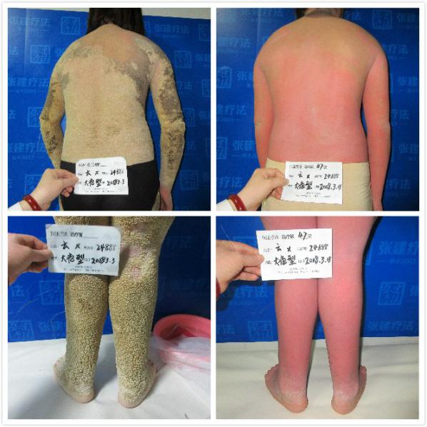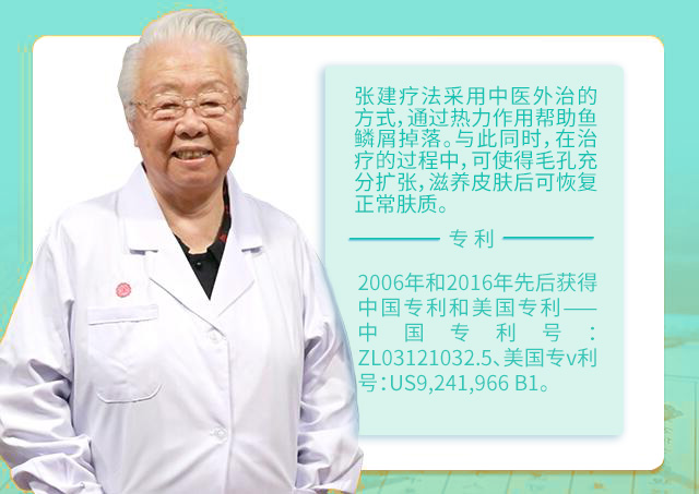 張建療法采用中醫(yī)外治的方式,通過(guò)熱力作用幫助魚鱗屑掉落。與此同時(shí),在治療的過(guò)程中,可使得毛孔充分?jǐn)U張,滋養(yǎng)皮膚后可恢復(fù)正常膚質(zhì) 在2006年和2016年先后獲得中國(guó)專利和美國(guó)專利 中國(guó)專利號(hào):ZL03121032.5、美國(guó)專利號(hào):US9,241,966 B1。